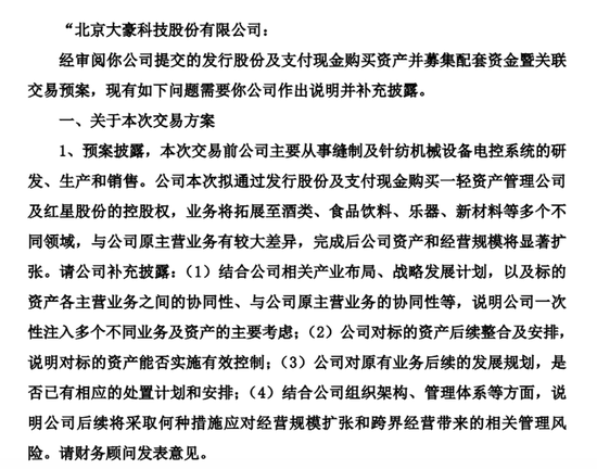 上交所称,公司本次拟通过发行股份及支付现金购买一轻资产管理公司及红星股份的控股权,业务将拓展至酒类、食品饮料、乐器、新材料等多个不同领域,与公司原主营业务有较大差异,完成后公司资产和经营规模将显著扩张。