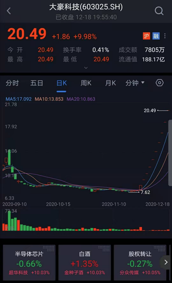 公开信息显示,停牌公告前一交易日,大豪科技11月23日股价为8.69元,涨幅10%。重组预案发布至今,大豪科技连续10日涨停(9个一字涨停)。截至12月18日收盘,股价为20.49元/股,总市值达189.9亿元。