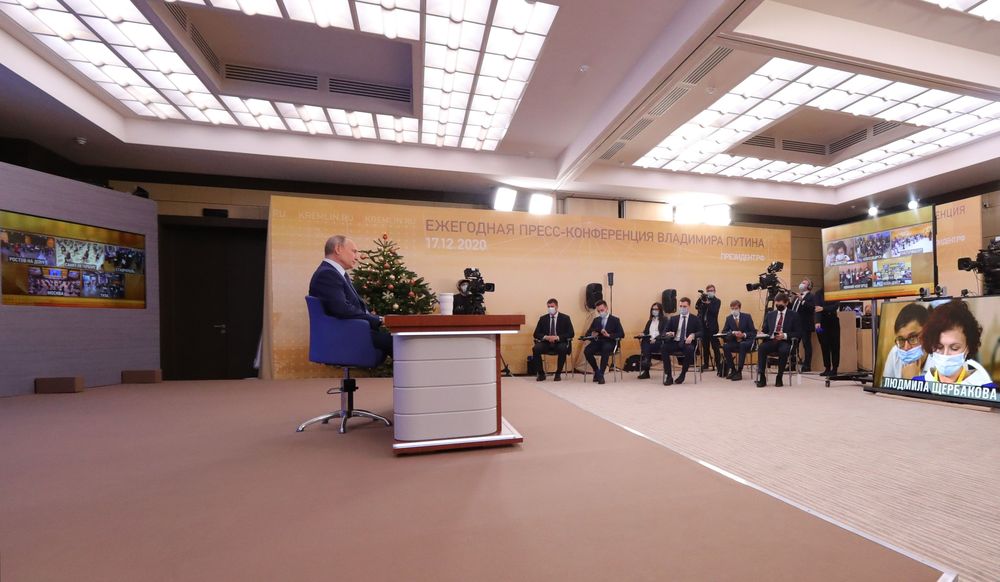 12月17日,俄罗斯总统普京在位于莫斯科州的新奥加廖沃总统官邸通过视频方式出席年度记者会。(新华社/法新)