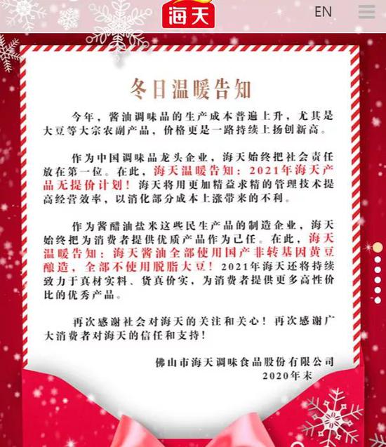 对此,海天味业17日在官网发布通告称,2021年海天产品无提价计划。