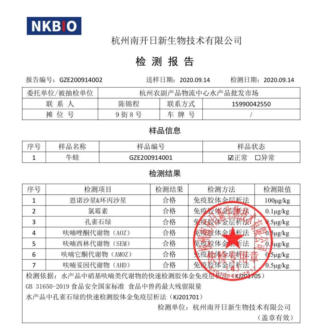 ★调查中,上海哥老官餐饮管理有限公司还出具了其委托第三方检测公司对牛蛙的检测报告,最近一批是2020年11月17日送检的牛蛙,检测结果显示为合格。