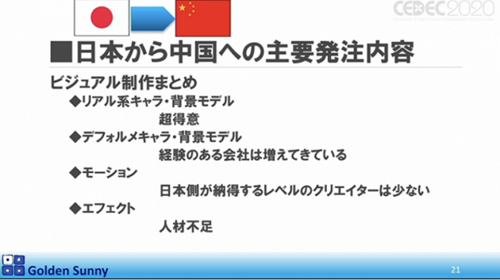 卖人设抽卡模式的兴盛又导致另一个现象,在今年九月日本举办的CEDEC 2020上,ゴールデンサニー董事长田村俊彦分享表示,从中国到日本的角色设计和剧本的订单正在不断增加,特别是角色设计方面。“中国的角色设计大多数头和身体都比较高,转化成二次元画风的话比较困难。中国对日本的要求是2D角色设计,在这个领域日本还处于中国的前列。剧本有时也会向日本订购。在中国,例如《三国志》、《水浒传》等以古典小说为基础的剧本很多,在游戏中很难表现出独特性和创意性,这时日本人的创意就能被运用其中。”
