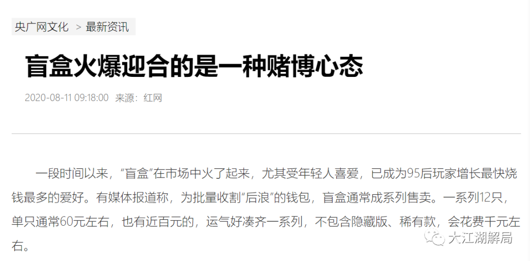 官媒“央广网”也转发了一篇文章《盲盒火爆迎合的是一种赌博心态》,认为盲盒的玩法合规性存疑,可能被《反不正当竞争法》认定为有奖销售。
