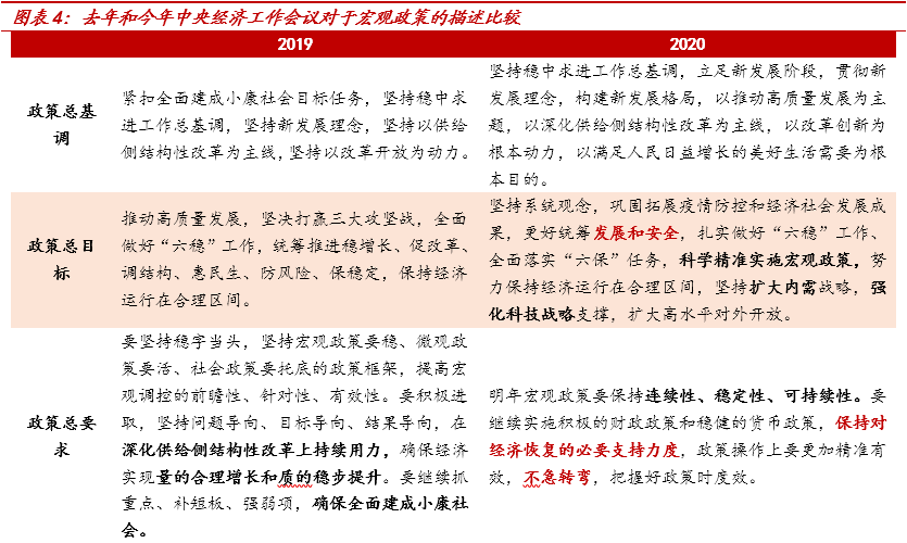去年和今年两次会议都强调了“提质增效”,不过在财政支出结构上,今年会议做了进一步的细化,比如“增强国家重大战略任务财力保障”,“在促进科技创新、加快经济结构调整、调节收入分配上主动作为”。反映未来财政资金在科技、新经济领域的支持力度继续增大,新基建仍会保持一定的高增长,不过考虑到新基建目前规模仍远小于传统基建,对经济的支撑力度是有限的。另一方面,会议提及在收入分配上主动作为,后续可能会推出一些税制上的改革,在社会保障领域的支出力度也可能会有所增加。今年重提“抓实化解地方政府隐性负债风险工作”(18年提及,19年未提及),明年地方隐性负债的监管仍然会较为严格。