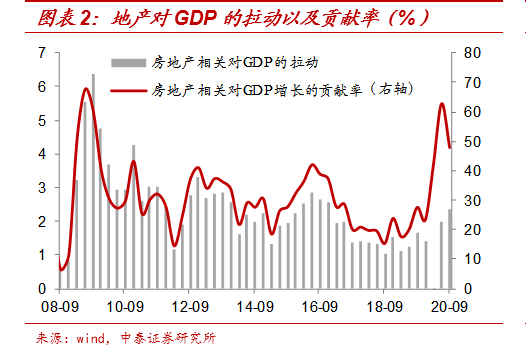 会议同时强调,“疫情变化和外部环境存在诸多不确定性,我国经济恢复基础尚不牢固”。虽然经济在持续修复,但驱动经济修复的主要动力在投资。前三季度最终消费支出对GDP同比的拉动为-2.4%,处于历史低位,而资本形成总额对GDP同比的拉动则达到3%。而固定资产投资中又属地产投资最为强劲,前11月固定资产投资累计增速为2.6%,房地产投资增速达到了6.8%。从对经济增长的贡献角度来看,如果把地产对其他产业的拉动考虑在内,二季度房地产对GDP增长的贡献超过60%,三季度仍然接近50%。