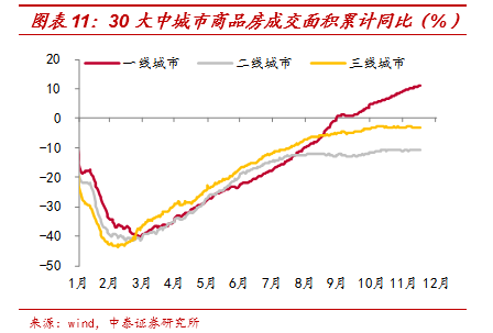 回顾今年房地产市场,更多是核心城市销售火爆、房价上涨,和货币放水有较大的关系,中小城市上涨幅度相对较小。今年3月份以来,各地二手房价格走势出现持续分化,一线城市持续走强,二三线城市缓慢走弱。销售端也是类似,截至12月中旬,一线城市商品房成交面积累计同比达到11%,而三线城市仅为-3.2%。