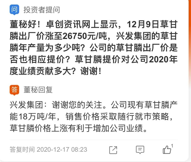 17日,兴发集团在互动平台表示,目前草甘膦市场价格约2.75万元/吨(含税)。公司现有草甘膦产能18万吨/年(含泰盛公司13万吨/年、内蒙兴发5万吨/年),目前生产装置正常开车,草甘膦价格上涨有利于增加公司业绩。