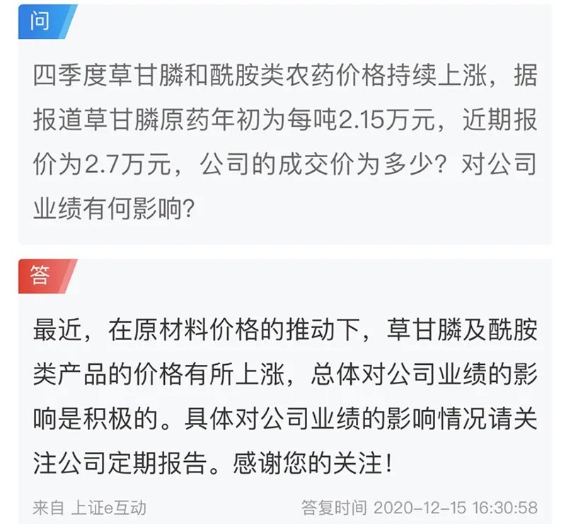 江山股份在互动平台表示,最近,在原材料价格的推动下,草甘膦及酰胺类产品的价格有所上涨,总体对公司业绩的影响是积极的。