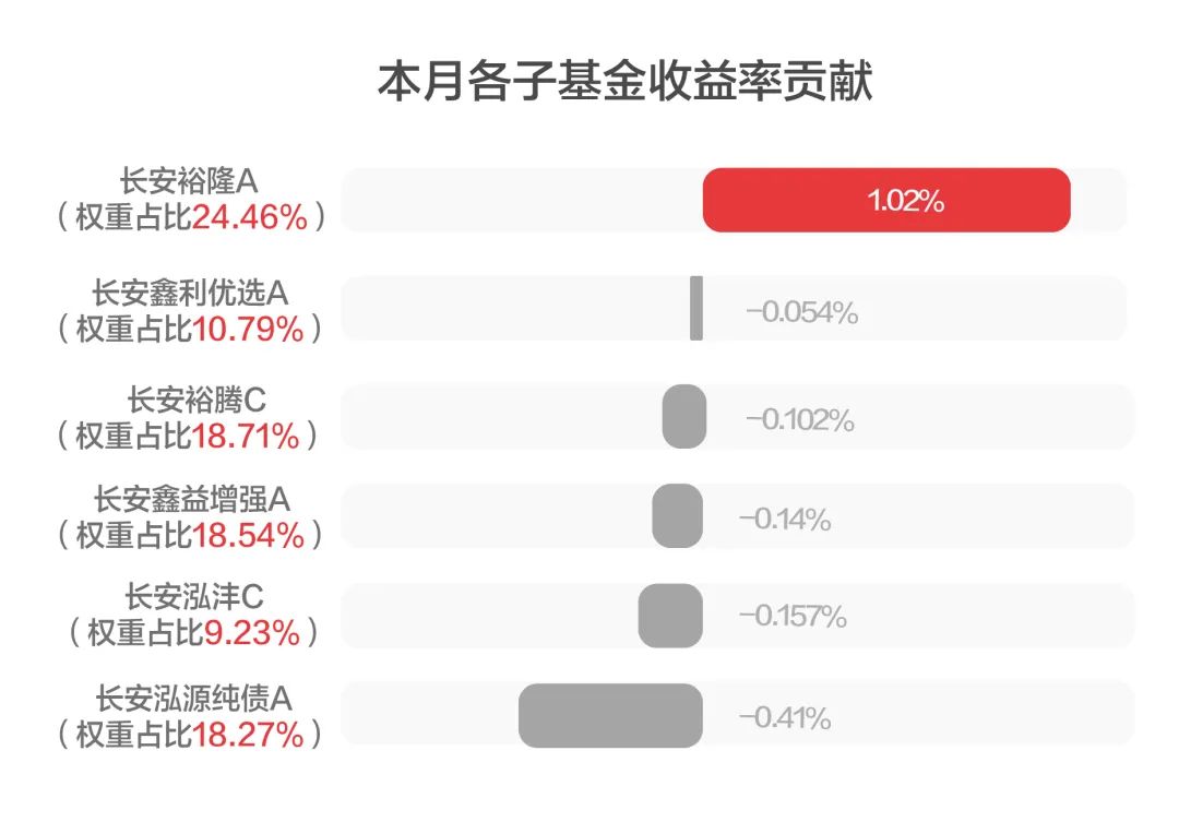 从收益贡献角度看,11月组合中仅有长安裕隆带来正收益贡献,其余均为负收益。但由于长安裕隆相对持仓占比较高,其正收益贡献覆盖了其余子基金净值下跌的影响,因此全月组合净值小幅上涨。