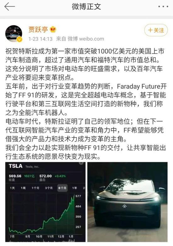 早在今年初,贾跃亭就曾发微博“祝贺”特斯拉成为“第一家市值突破1000亿美元的美国上市汽车制造商”,并将称“FF希望能够凭借强大的产品力和技术力成为变革的主角”。