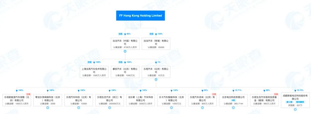 天眼查显示,法法汽车(珠海)有限公司于2020年12月14日注册成立,注册资本2.5亿美元,公司法人贾晨涛同时担任乐视生态汽车(浙江)有限公司的监事,公司经营范围涵盖了新能源汽车整车销售;新能源汽车生产测试设备销售;汽车新车销售;汽车零部件及配件制造;新能源汽车电附件销售;电动汽车充电基础设施运营等方面。