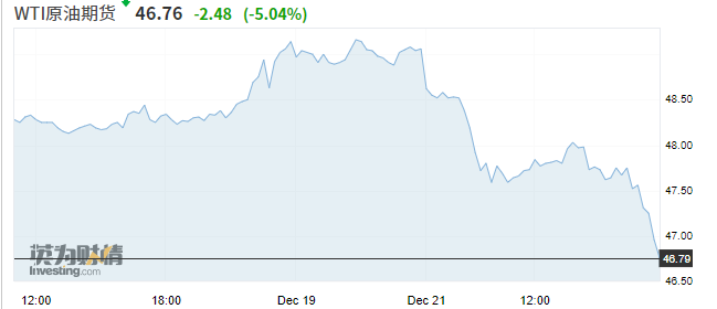在此影响下,周一国际油价大跌。截至发稿,WTI原油期货下跌超5%至46.76美元/桶,跌至上周二以来新低。布伦特原油跌超5%至49.79美元/桶,跌破50关口。