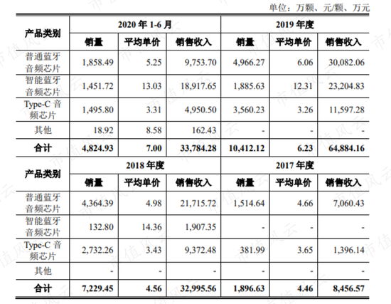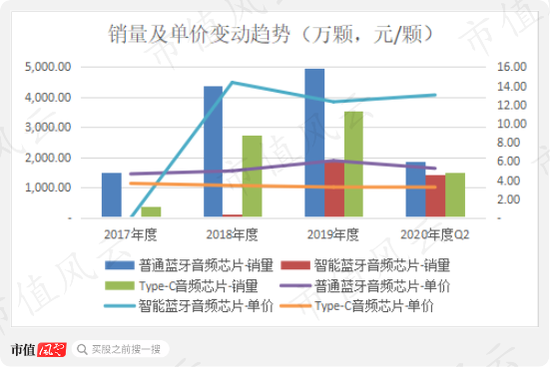 普通蓝牙音频芯片和2017-2019年量价齐升,销量增长至4966.27万颗,平均单价升至6.06元/颗。2020年Q2销量、单价均比同期下降。
