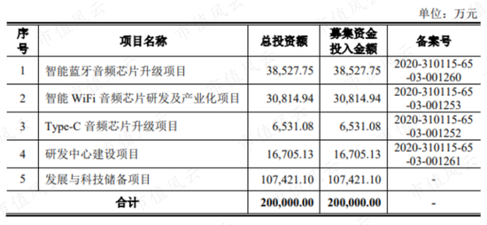本次募集资金20亿,约有9.3亿预计用于智能蓝牙音频芯片升级项目、智能 WiFi 音频芯片研发及产业化项目和研发中心建设项目等。