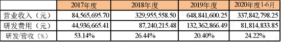 研发费用逐年递增,增长迅速。2020年Q2研发费用占营收24.22%。在行业中研发费用投入规模较小,但是研发费用与收入占比名列前茅,也与公司处于成长期相关。