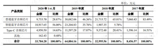 2019年普通蓝牙音频芯片营收为3.01亿元,占比营收的28.87%,智能蓝牙音频芯片营收为2.32亿元,占比56%,成为营收的主要贡献者。Type-C音频芯片的营收为1.16亿元,占比14.65%。其他金额较小。