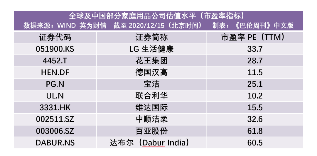 在欧洲,提供洗涤产品的知名家庭用品公司有利洁时(Reckitt Benckiser Group )和德国汉高。德国汉高最新的市盈率(TTM)约为11倍;利洁时因2019年遭遇了亏损,目前市盈率为负,其过去五年间的市盈率(TTM)最高值为33倍。