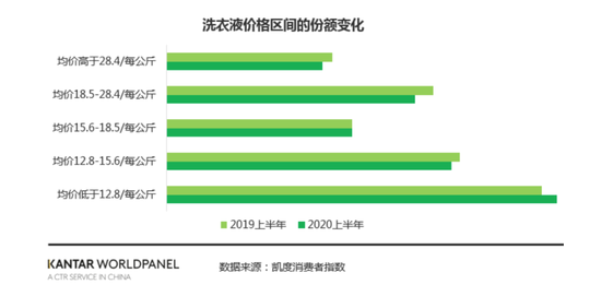 根据凯度(Kantar)的研究报告,中国日化类市场今年整体上较去年小幅增长。不同于疫情导致的消毒杀菌产品猛增,洗衣产品的表现总体平稳,价格增长放缓。其中,洗衣粉、洗衣皂保持了平稳,而洗衣液产品均价下降。其中,在洗衣液产品细分中,今年上半年,只有大众级产品较去年同期价格有所提升,高端洗衣液价格并没有呈现增长态势。随着消费者理念成熟,洗衣液高端化有放缓的迹象。