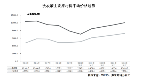 但如果追溯至2017年,又会看到,其当年销售净利率仅为1.53%。净利润率增幅从何而来?蓝月亮在招股书中已坦陈,主要来自原材料价格的下跌。棕榈油和低密度聚乙烯(LDPE),是蓝月亮的主要生产原料,前者用于产品,后者用于包装,两者合计在总成本中的占比接近80%。从2017年1月到2020年1至4月,棕榈油的市场均价从约5800元/吨下降到约4800元/吨,低密度聚乙烯的市场均价从接近10000元/吨下降到约7000元/吨,降幅巨大。年初,新冠疫情抑制了即将重新上涨的棕榈油价格。根据弗若斯特沙利文咨询公司的预测,未来几年,以上两类原材料价格将稳步回升,也就是说,蓝月亮的利润率有可能随之下滑,并向两年前的常态回归。