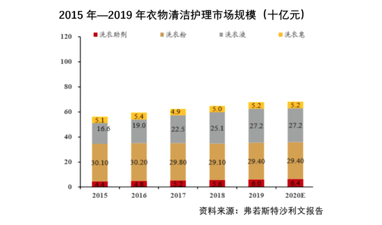 在衣物清洁护理市场,根据弗若斯特沙利文报告,2019年,蓝月亮的市场份额为10.4%,列第四位,行业前三的市场份额分别是25.4%、11.6%、11.0%。