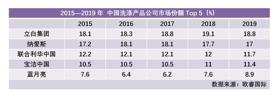 根据来自欧睿国际的数据,2015年—2019年,中国洗涤市场的市场份额排名稳定;这五年间,前五名的秩序一直没有变化,前四名依次是立白集团、纳爱斯、联合利华中国和宝洁中国;蓝月亮虽然市占率有所增长,从7.6%上升至8.9%,但始终只是整个洗涤行业的第五名。