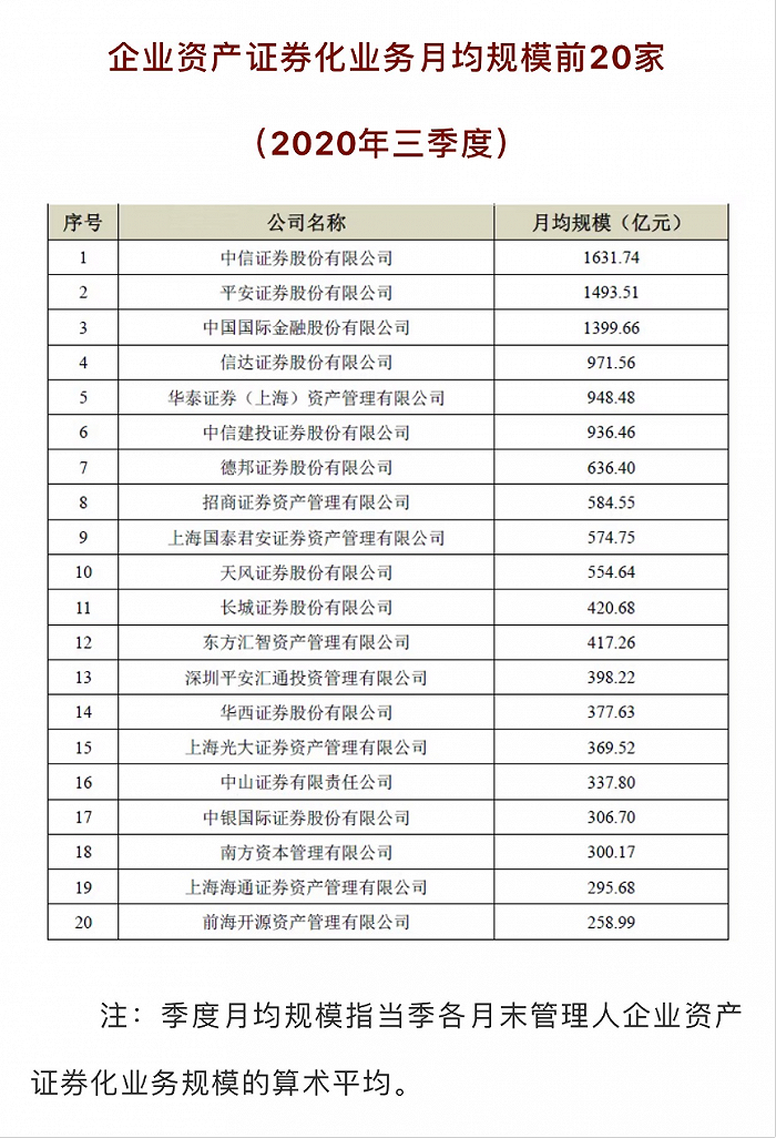 2020年三季度,德邦证券的企业资产证券化业务月均规模636.40亿元,排名行业第7位。
