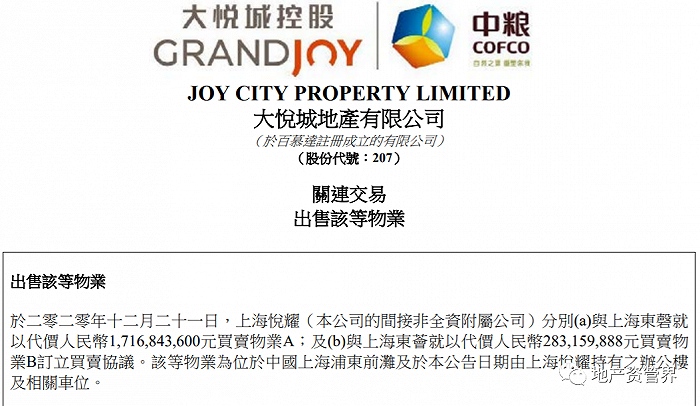 图片来源:视觉中国12月21日,大悦城地产发布公告称,旗下子公司上海悦耀分别向上海东磬17.17亿元出售物业A,向上海东荟2.83亿元出售物业B,两次共涉资20亿元。
