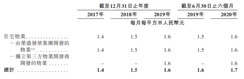 从收费情况来看,荣万家生活的月均收费亦要低于行业平均。2017-2019年及2020H1其的住宅物业平均每平月收费为1.4元、1.5元、1.6元及1.7元,低于2019年行业平均收费的2.1元。