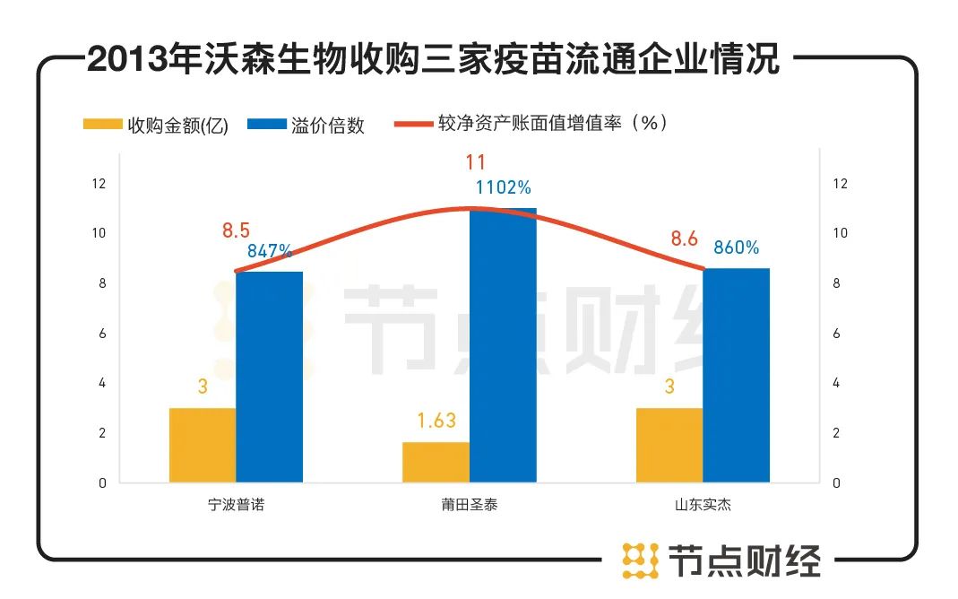 2013年7月,沃森生物以7.63亿元收购了三家疫苗流通企业100%股权,分别是以3亿元收购的宁波普诺,以1.63亿元收购的莆田圣泰,以3亿元收购的山东实杰。较净资产账面值增值率分别为847%、1102%和860%,照此计算,溢价分别为8.5倍、11倍和8.6倍。