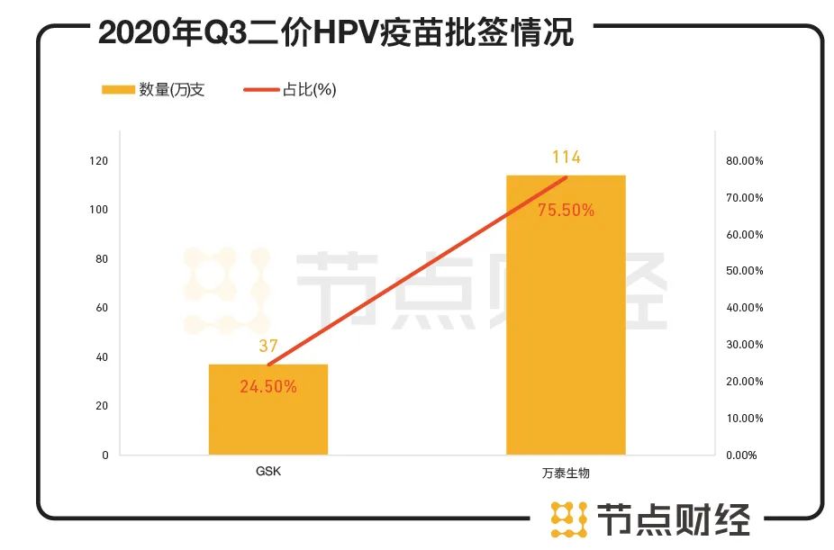 万泰生物在今年4月获批上市的正是二价HPV疫苗,此前二价只有海外巨头GSK生产,可以说万泰生物这款疫苗是首款国产HPV疫苗,打破了国外的垄断。凭借亲民的价格,万泰生物一举抢下了大部分的市场份额。天风证券研报数据显示,2020Q3,二价HPV疫苗批签发约151万支,其中GSK37万支,占比 24.5%,万泰生物114万支,占比 75.5%。