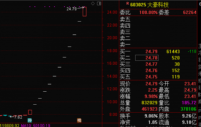 大豪科技(603025.SH)近段时间的表现确实比较“豪气”,盘面显示,自11月23日涨停算起,至今共计12个交易日,大豪科技就录得了12个涨停,累计涨幅213.8%,由于其中“一字涨停”较多,所以12个交易日的累计换手率才13.18%,以9.26亿股的总股本来计算,这12天来大豪科技的市值就增长了156亿元。