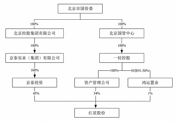 据悉,资产管理公司目前的主营业务是履行离退休管理服务、代管非主业企业股权职能。一轻控股拟将酒类、食品及饮料等主业相关资产进行整合后注入资产管理公司,并将资产管理公司现有职能剥离。相关资产注入资产管理公司后,资产管理公司将以酒类、食品及饮料等相关业务为主营业务,主要产品包括“红星”品牌系列白酒,“北冰洋”品牌系列饮料产品,“义利”品牌系列食品等产品。一轻控股直接及间接持有红星股份55%的股份,京泰投资持有红星股份45%股份。红星股份主营业务为白酒的生产和销售,主要产品包括“红星”品牌系列白酒。