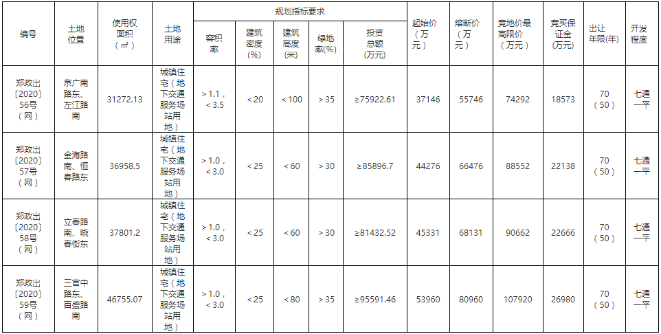 郑政出〔2020〕53号(网)位于纪元路(苏屯路)南、鲁河路西。出让面积42177.6㎡,起始价52617万元,竞买保证金26309万元,最高限价105234万元,建筑密度<25%,绿地率>30%,建筑高度<80米,投资总额≥101321.42万元。