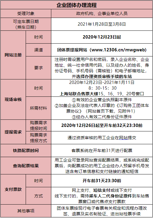 2020年12月26日起,网站开始受理团体购票需求。通过资质审核的用工企业可在网站提交开车前32天23:30前购票需求。配票完成后,系统向配票成功的用工企业经办人预留手机号发送含有订单信息和支付链接的通知短信,用工企业也可登录网站查询配票结果。