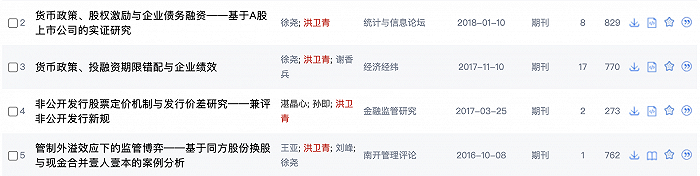 万方数据显示,2001年至2017年,洪卫青共计发表11篇期刊论文及1篇学位论文,其中4篇论文被核心期刊收录。2008年博士毕业后,洪卫青发文之路进入7年断档期。2015年入职中证金融研究院后,洪卫青共计发表了5篇论文,但均非第一作者,多为第二作者或第三作者。