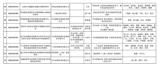 申万宏源证券方面包括,上海申银万国证券研究所首席经济学家杨成长负责《多层次资本市场转板上市机制研究——以中国台湾为研究对象》,上海申银万国证券研究所副总经理、首席战略研究员蒋健蓉牵头研究《深化资本市场中枢作用研究》,申万宏源证券法律合规总部副总经理(主持工作)孙兆军负责《金融监管和司法视域下投资者适当性管理的实证研究》。