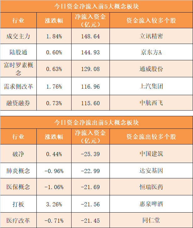 概念板块方面,今日成交主力、陆股通、富时罗素概念、需求侧改革等概念板块资金呈现净流入,其中成交主力概念净流入148.64亿元居首。