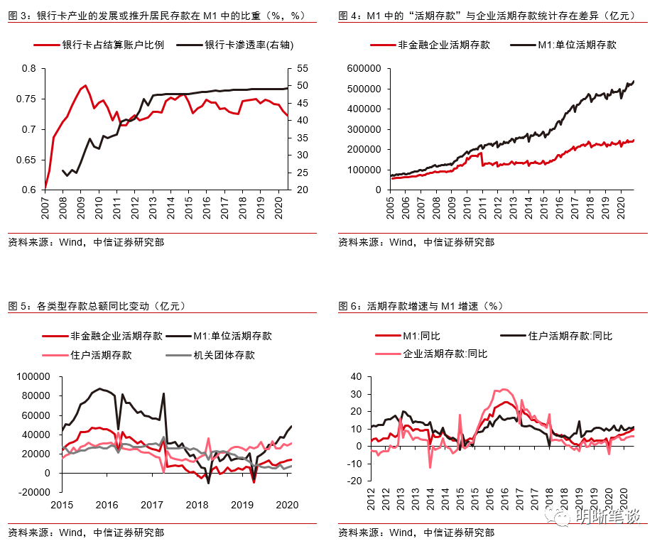 M1增长不仅仅源于企业活期存款。分析M1增长首先需要知晓M1的统计方式,而我国的M1也并非是M0与企业活期存款的简单加和,还统计了部分居民存款以及机关团体存款。参照1994年公布的《中国人民银行货币供应量统计和公布暂行办法》,当前我国的M1实际上包含了流通中现金、企业活期存款、机关团体存款、农村存款以及个人持有的信用卡类存款。之后至今央行并未对M1统计做出明示的统计口径调整。