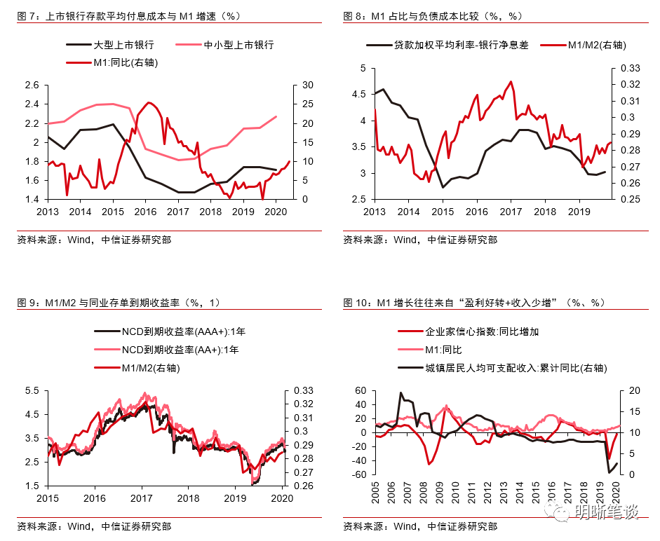 M1会影响银行负债总成本:活期高增推升综合负债成本。从直觉上说,由于活期存款的付息成本低于定期存款,因此如果新增存款中的活期存款占比更高,会降低银行存款负债整体的付息成本。但是存款负债的整体期限缩短往往意味着银行资产负债两端更严重的期限错配:商业银行要么通过提升定期存款付息率或者加强存款营销的形式募集定期存款,要么通过同业负债来平衡负债端的整体久期,这两种行动往往也会推升部分银行的负债成本。利用上市银行数据作为代表,我们可以发现2019年至今的M1增速持续走升对大型、中小型银行起到了相反的效应:2015年前,存款基准利率的变动对银行存款付息率起到主要作用;2016年至2018年末,以MLF利率为代表升降息周期对银行存款付息率起到主要作用;而2019年至今,MLF利率再度下降,但M1增速的走升却推升了中小行的存款付息率,我们认为这是不同规模银行存款募集能力区别的直接反映。由于这种分化的存在,我们利用贷款平均利率与银行净息差之差大致衡量银行的综合负债成本,可以看到M1在M2中的占比对银行综合负债成本的变化大致具有1-2个季度的领先性,如果考虑到数据公布的时滞,这种领先性可能是更加明确的。