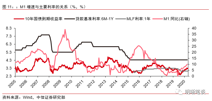 从2020年12月9日公布的金融数据看,当前M1同比增速已经攀升至10%,达到了近3年来的高位。从市场的解读看,M1增速的上行代表着企业有更多可投资或支出的活期存款,故而是当前经济增长走强、资本性开支需求上行的反映,将对债券市场产生利空效应。从年末时点债券市场走势来看,M1增速上移、经济温和回升却与现券市场不断走好同时出现;而历史上M1增速与利率债收益率的“正相关性”也并不十分稳健。那么当前M1的高增是否意味着债市收益率调整的压力?我们应当如何正确理解M1增速变化对债券市场的影响?本篇将加以解析。