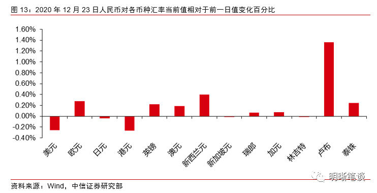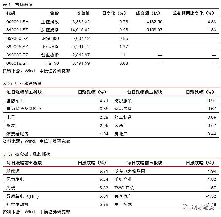 2020年12月23日,银存间质押式回购加权利率大体下行,隔夜、7天、14天、21天和1个月分别变动了-38.18bps、-23.82bps、-12.54bps、10.1bps和-11.65bps至0.59%、1.65%、2.84%、3.02%和3.04%。国债到期收益率全面下行,1年、3年、5年、10年分别变动-1.44bps、-1.25bps、-1.16bps、-1.25bps至2.66%、2.89%、3.02%、3.22%。上证综指上涨0.76%至3382.32,深证成指上涨0.96%至14015.02,创业板指上涨1.11%至2842.97。
