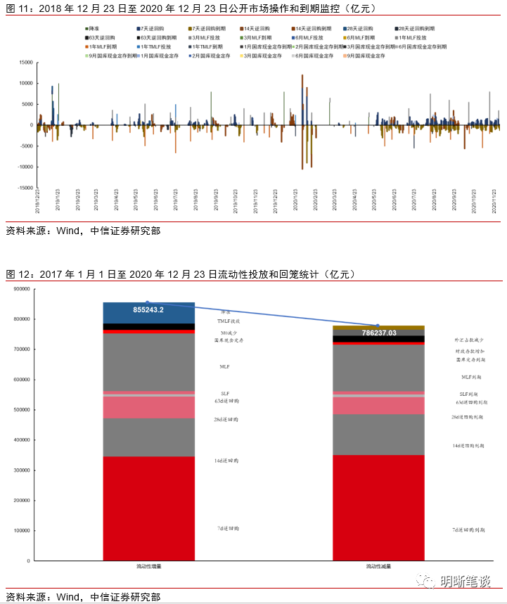 我们对市场流动性情况进行跟踪,观测2017年开年来至今流动性的“投与收”。增量方面,我们根据逆回购、SLF、MLF等央行公开市场操作、国库现金定存等规模计算总投放量;减量方面,我们根据2020年11月对比2016年12月M0累计增加13289.74亿元,外汇占款累计下降7788.46亿元、财政存款累计增加19412.53亿元,粗略估计通过居民取现、外占下降和税收流失的流动性,并考虑公开市场操作到期情况,计算每日流动性减少总量。同时,我们对公开市场操作到期情况进行监控。