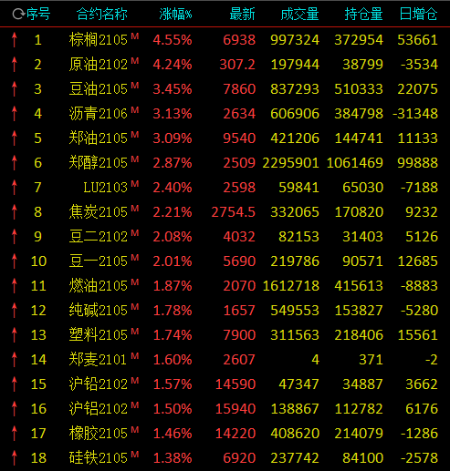 热点栏目12月24日,国内期市多数收涨,油脂油料大涨,棕榈油涨逾4%,豆油、菜油涨逾3%,豆一、豆二涨逾2%;能化品上涨,原油涨逾4%,沥青涨逾3%,甲醇涨近3%;黑色系分化,焦炭涨逾2%,玻璃、热卷跌逾1%。