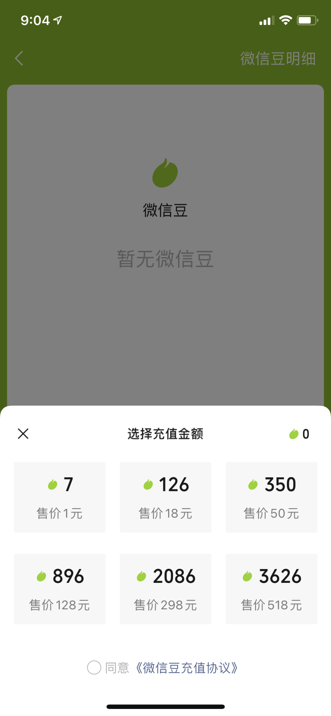 微信豆可以在个人主页里购买。ios端可以看到定价为7个1元、126个18元、350个50元、896个128元、2086个298元、3626个518元。