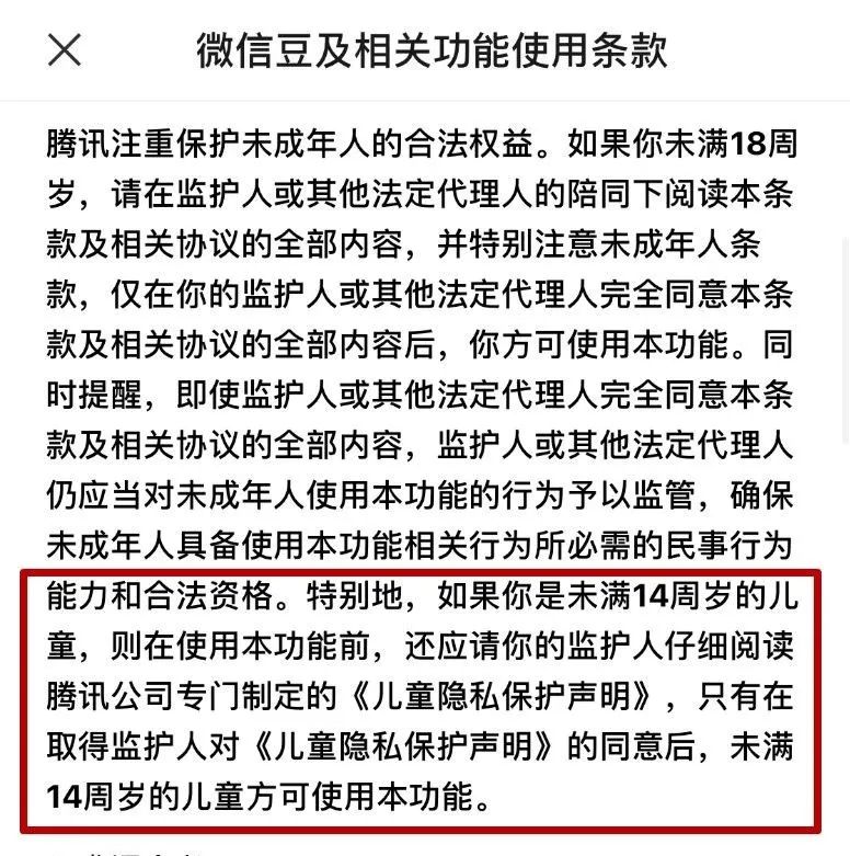 澎湃新闻注意到,在微信豆及相关功能使用条款中写道,针对未满14岁的儿童需取得监护人对《儿童隐私保护声明》的同意后才能使用该功能。