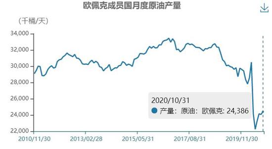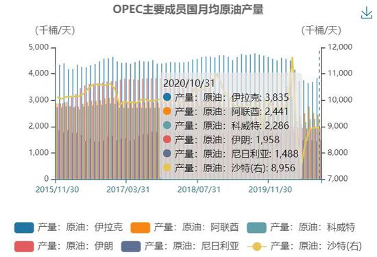 截止至2020年10月,当月欧佩克月度原油产量合计为24,386千桶/天,较上月增加322千桶/天。其中沙特阿拉伯产量为8,956千桶/天,较上月无变化;伊拉克产量为3,835千桶/天,较上月增加148千桶/天;阿联酋产量为2,441千桶/天,较上月减少74千桶/天;科威特产量为2,286千桶/天,较上月减少6千桶/天;伊朗产量为1,958千桶/天,较上月减少5千桶/天;尼日利亚产量为1,488千桶/天,较上月增加47千桶/天。
