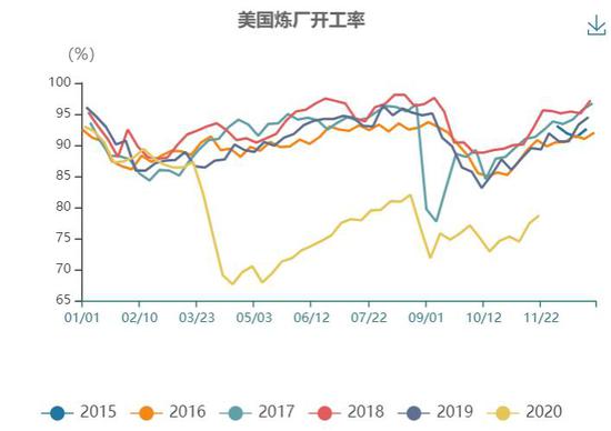 美国汽油库存处于较低水平但近期略有上升,航空煤油及取暖油库存较低,主要与炼厂开工下降及生产结构调整有关。