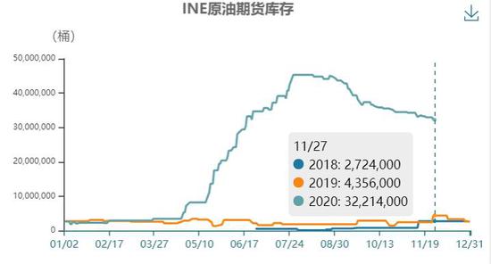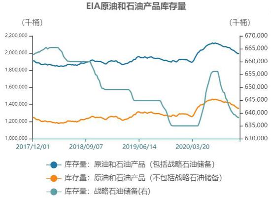截止至2020年11月20日,美国原油和石油产品(含战略储备)合计库存为1,992,034千桶,较前周减少1,181千桶;其中战略石油储备为638,190千桶,较前周减少111千桶;商业原油库存为488,721千桶,较前周减少754千桶,库存环比下降0.15%,同比上升8.14%;库欣地区商业原油库存为59,892千桶,较前周减少1,721千桶。