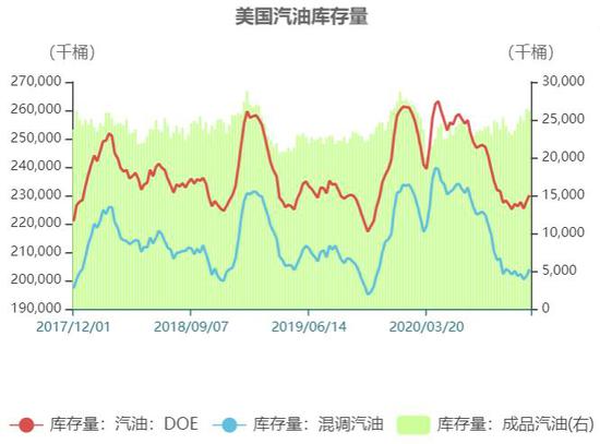 截止至2020年11月20日,美国汽油库存为230,147千桶,与上周比增加2,180千桶;航空煤油库存为37,142千桶,与上周比减少156千桶;馏分燃料油库存为142,632千桶,与上周比减少1,441千桶;取暖油库存为8,841千桶,与上周比增加231千桶;丙烷/丙烯库存为64,500千桶,与上周比减少168千桶;半成品油库存为78,680千桶,与上周比增加552千桶;其他油品库存为231,273千桶,与上周比减少1,087千桶。