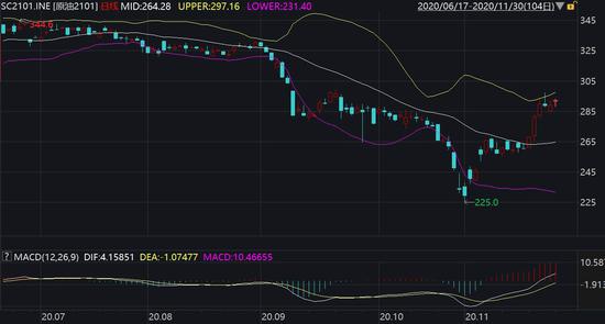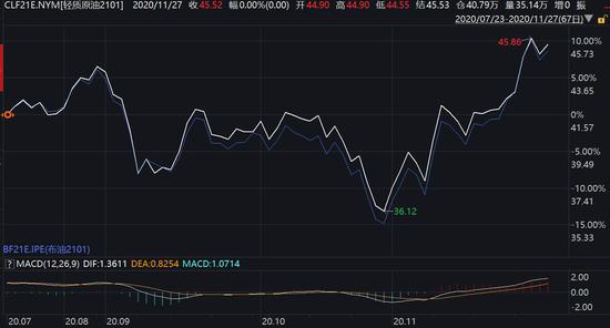 11月,原油价格整体呈明显反弹走势,上海原油反弹幅度29.73%,布伦特原油反弹幅度27.58%。反弹可分为两个阶段,月初受辉瑞疫苗有效性较高及美国大选初选结果影响,国际油价大跌后反弹。11月23日,受欧佩克+延长减产预期、沙特炼厂遇袭等中东局势以需求复苏预期等影响,油价加速反弹,幅度更大。